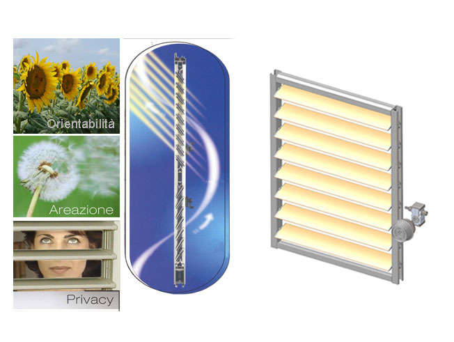 L'orientamento totale delle lamelle consente ai raggi solari di penetrare dall'alto e di illuminare al massimo gli ambienti in ogni ora del giorno oltre a consentire dall'interno un'ampia visione esterna nel pieno rispetto della privacy. Il ribaltamento totale delle lamelle sino a 180º facilita inoltre il naturale ricambio dell'aria specie in ambienti soggetti a particolari tipi di inquinamento (bagno, cucina, locali in cui si fuma o si svolge attività fisica).
